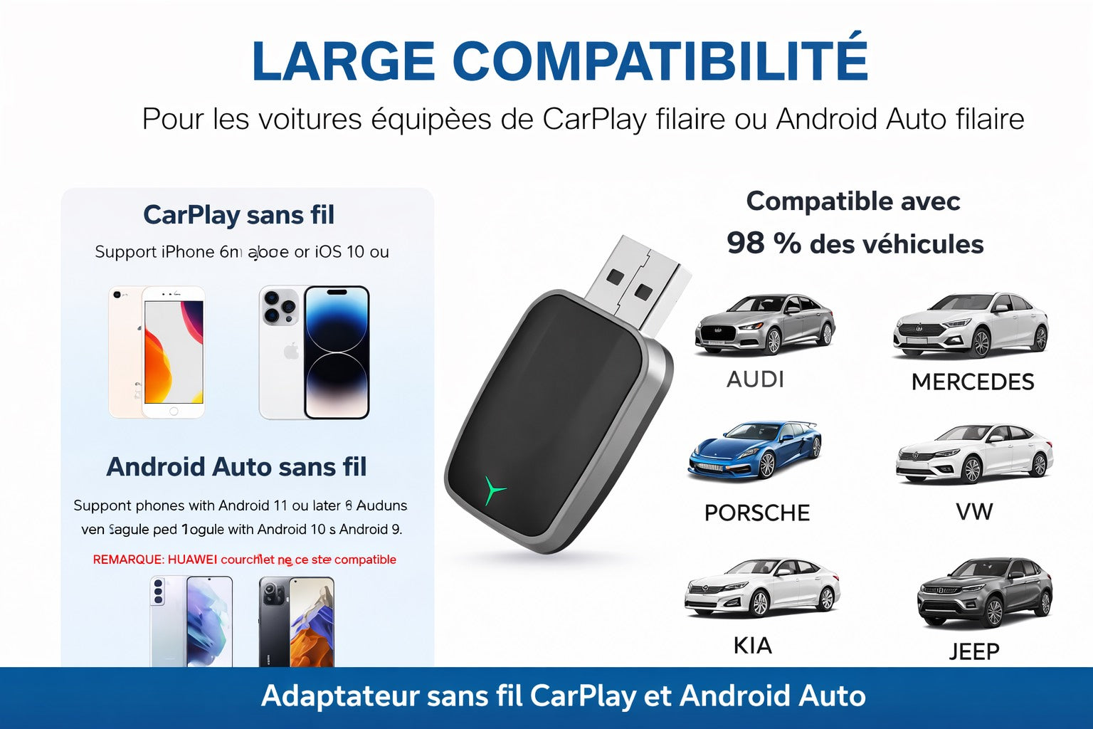 Fonctionne avec la majorité des véhicules équipés de CarPlay ou Android Auto filaire d’origine (à partir de 2017).